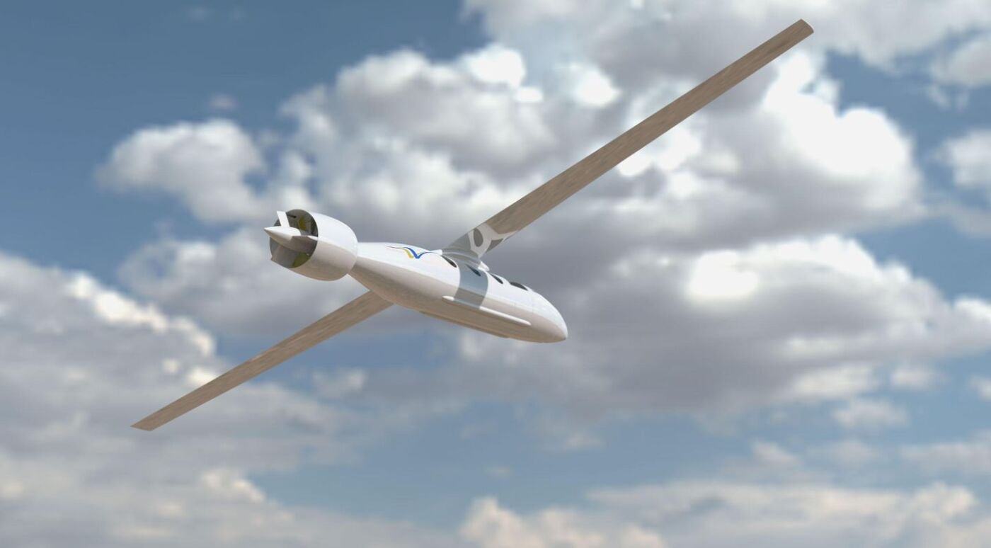 A empresa Ampaire pretende modificar um avião de seis passageiros chamado TailWind. Esta ilustração mostra a aeronave voando alto, acima das nuvens.