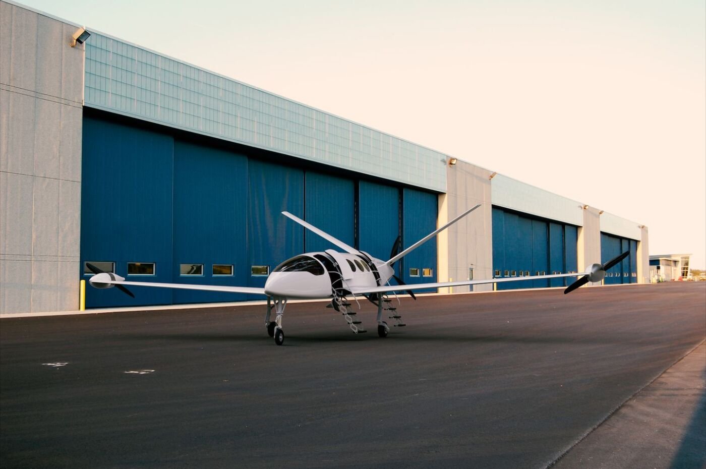 Uma representação visual do avião Alice commuter da empresa Eviation, que apresenta hélices localizadas nas extremidades das asas.